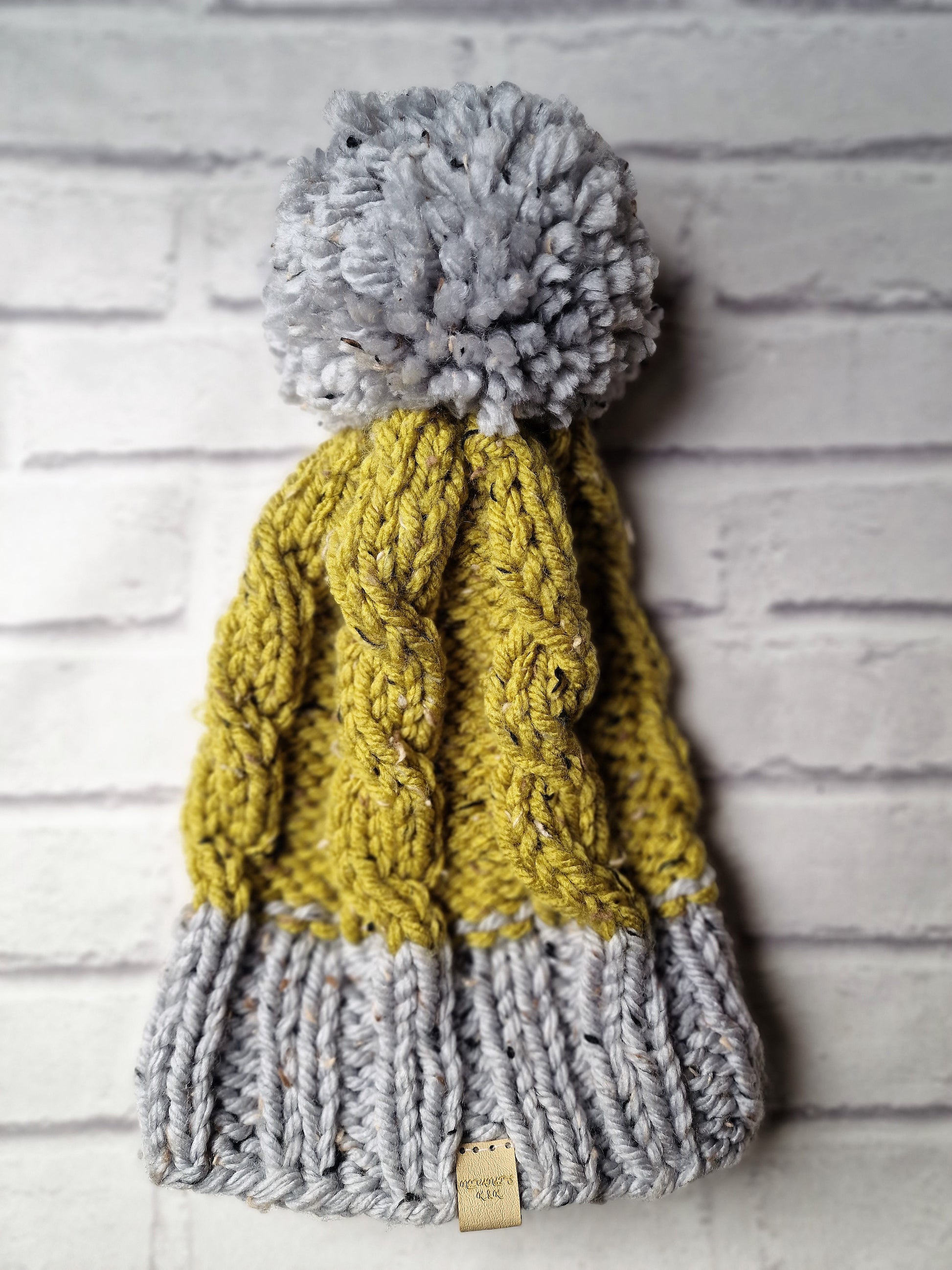 Adult size, chunky hand knitted hat with giant pom.