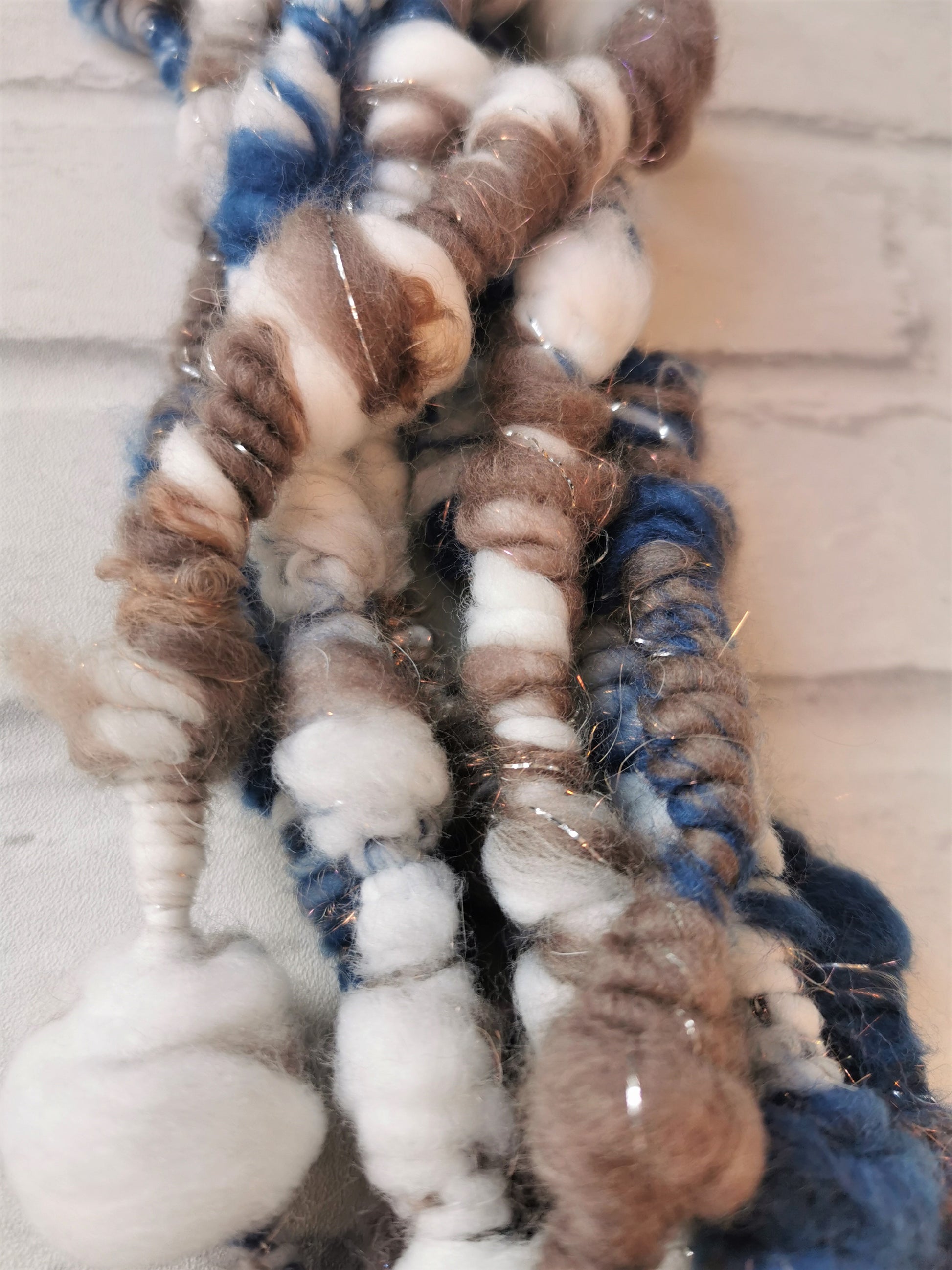 Fibres; Dyed merino, Nylon top, Angelina, Silver thread wrapping
